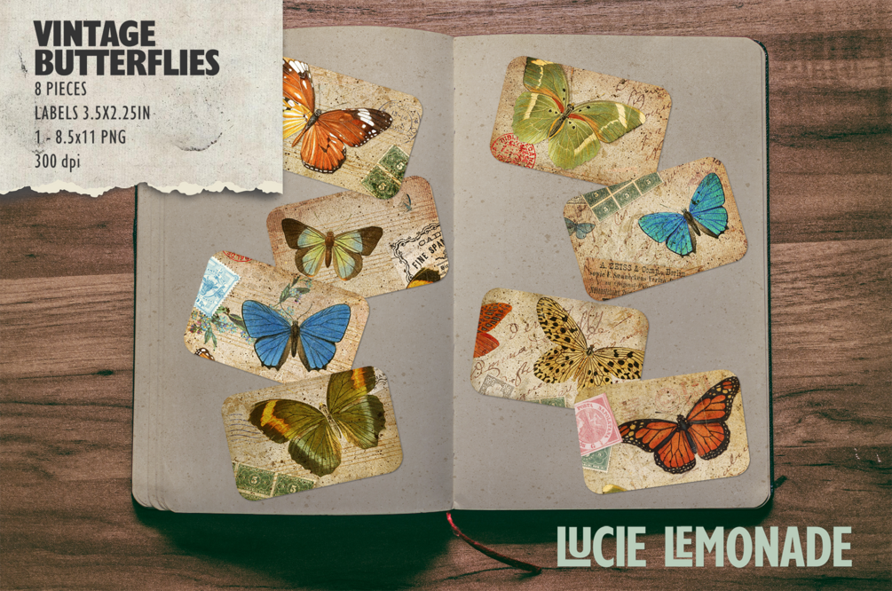 Vintage Labels: 8 digital labels decorated with vintage butterfly illustrations in earthy, vintage paper background with orange, blue, green and earth tone colors and accents.