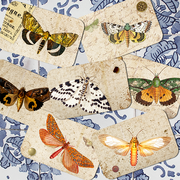 Vintage Labels: 8 digital labels decorated with vintage moth illustrations in earthy, vintage paper background with orange, blue, green and earth tone colors and accents.