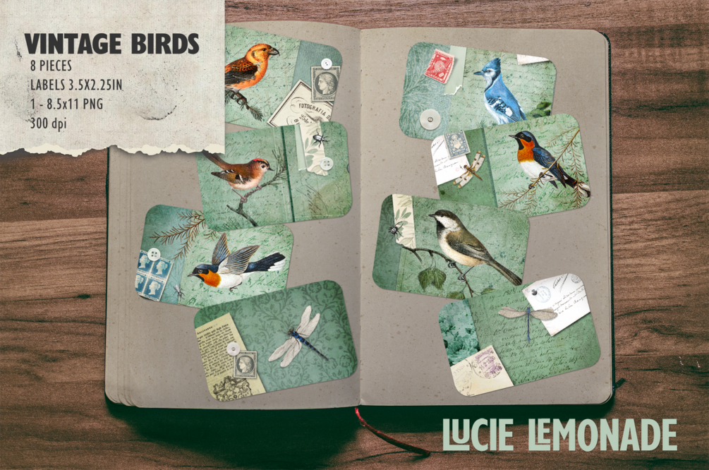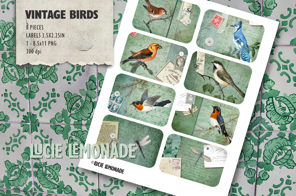 Vintage Labels: 8 digital labels with vintage bird illustrations.