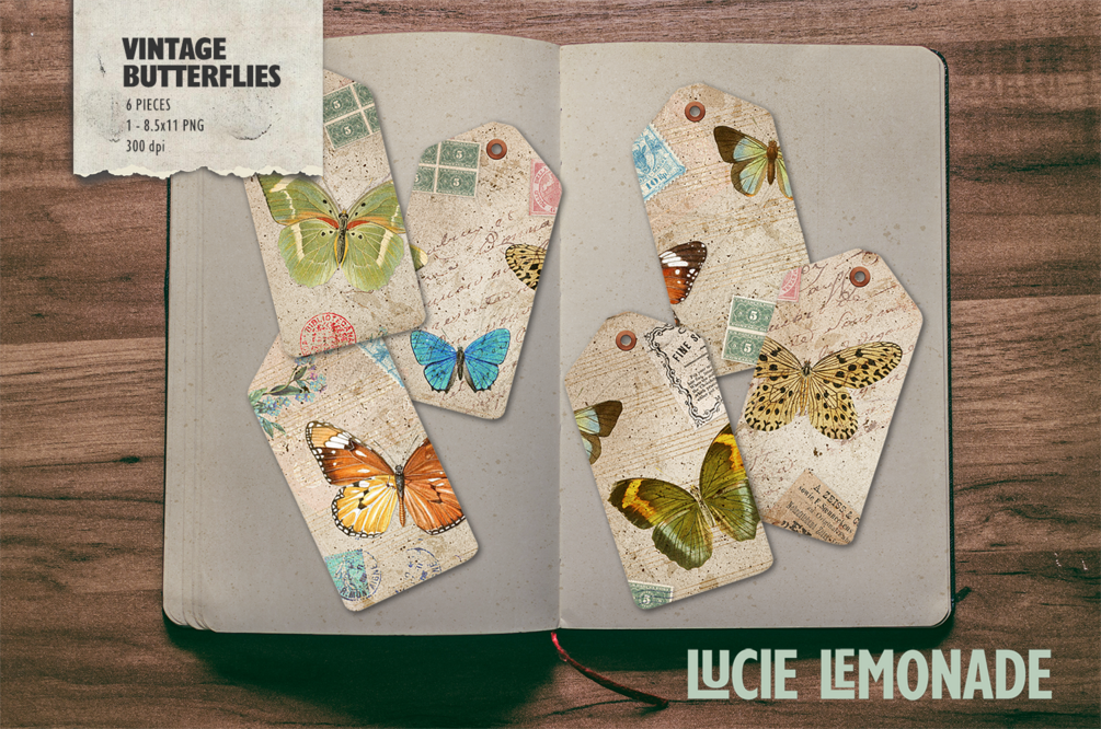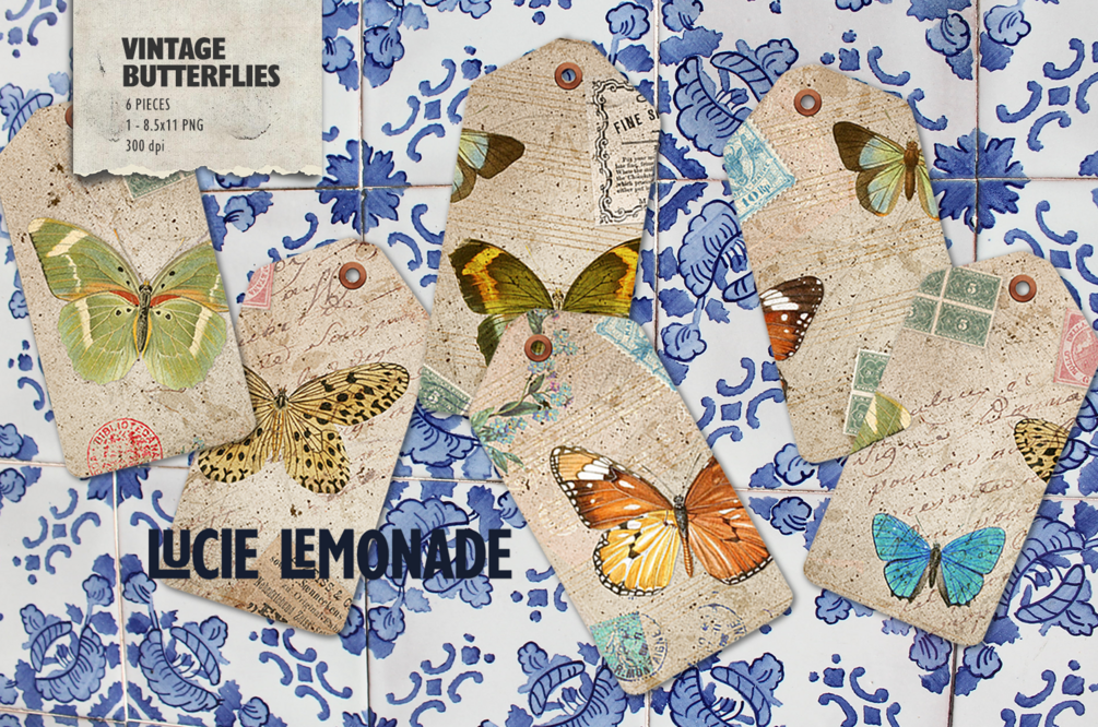 Vintage Tags: 6 digital tags decorated with vintage butterfly illustrations in earthy, vintage paper background with orange, blue, green and earth tone colors and accents.