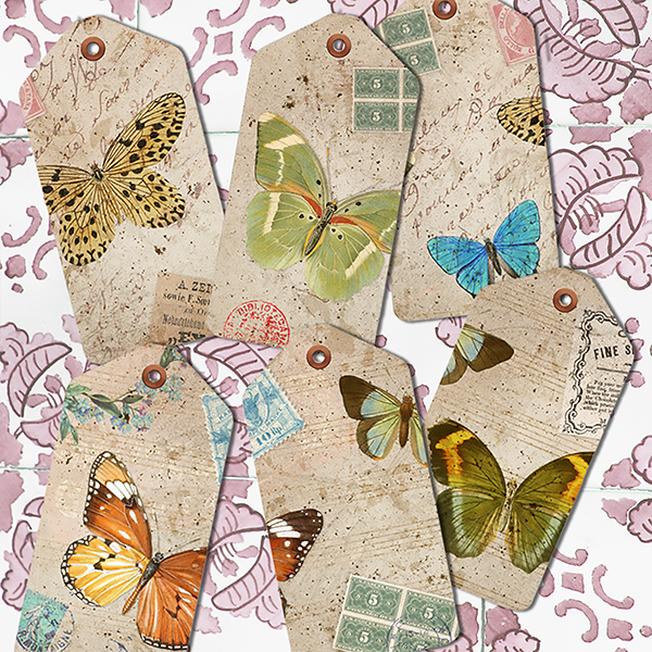 Butterfly Junk Journal Tags, Digital Download, Printable, Vintage Butterflies, Ephemera Pack of 6 Tags