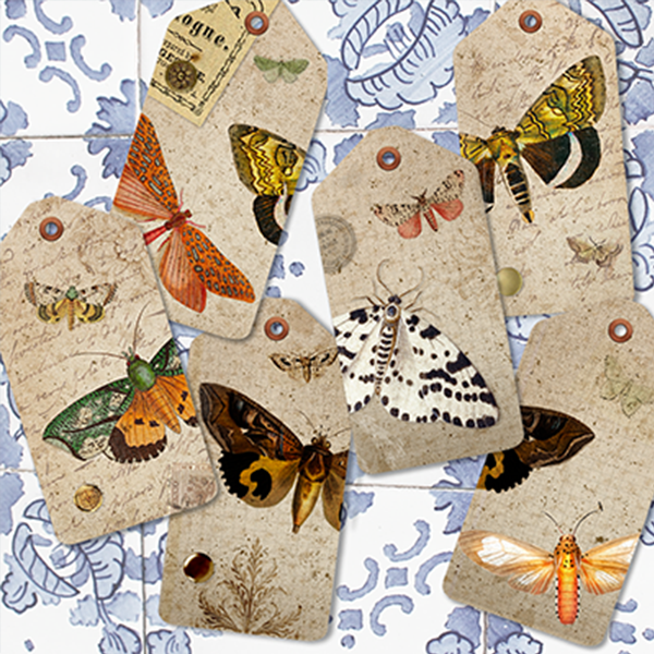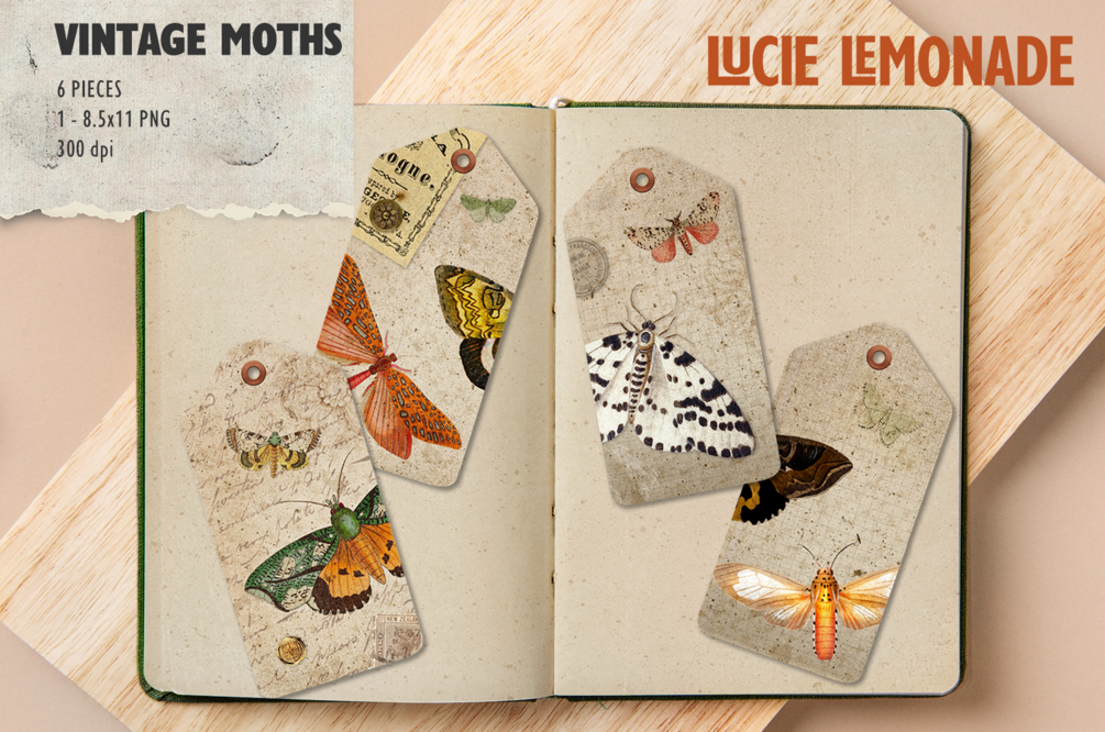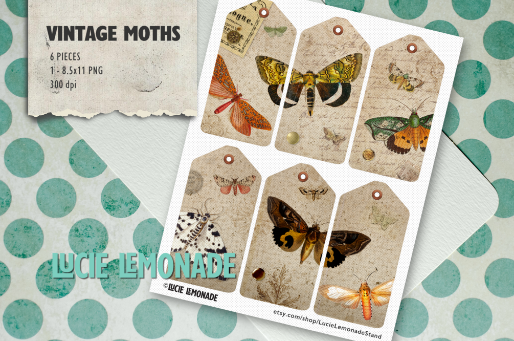 Vintage Tags: 6 digital tags with vintage moth illustrations in earthy, vintage paper background with orange, blue, green and earth tone colors and accents.